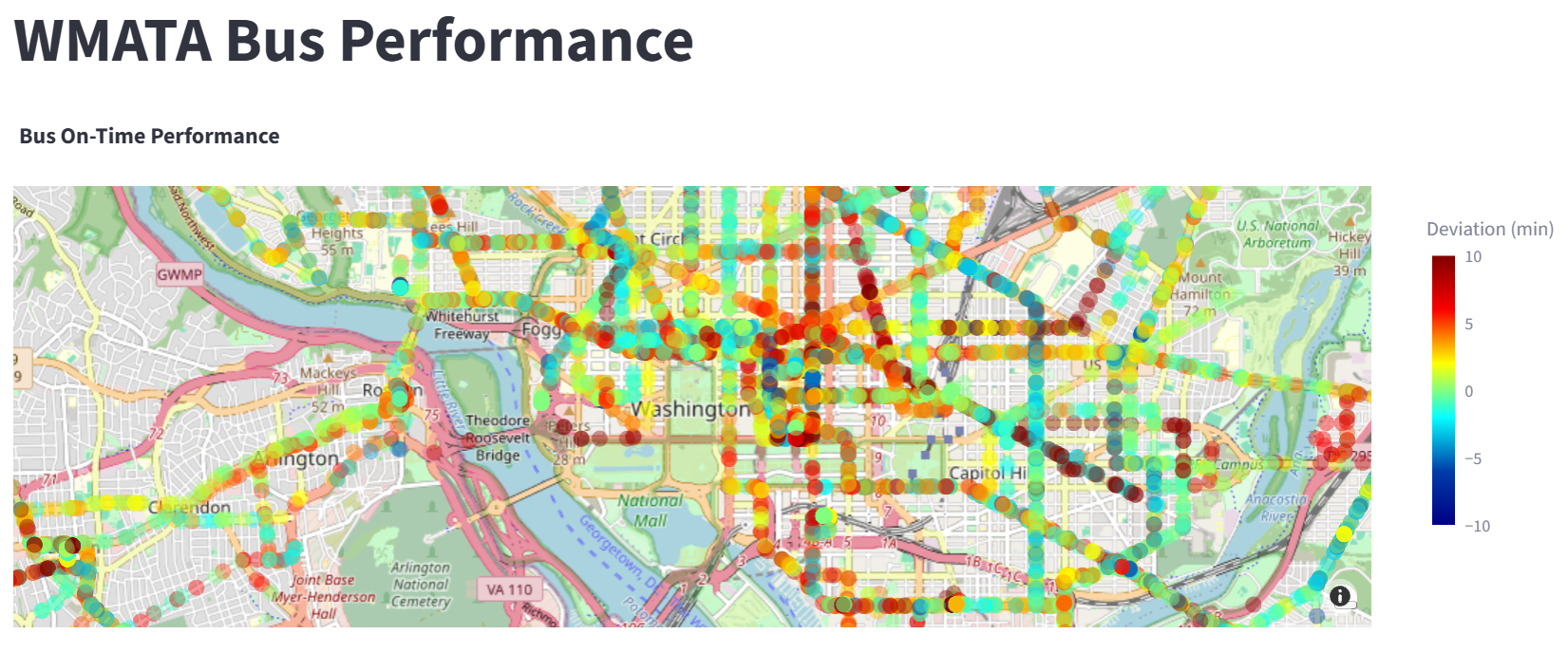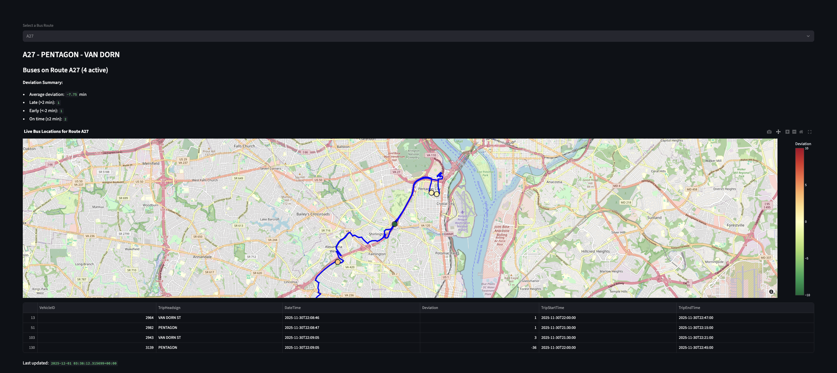 Data engineering project created for DS3022. Processes real time streaming updates from WMATA API to store live bus status in a DuckDB table using a Kafka producer and consumer. Displays current bus location on route and delay time on a streamlit dashboard.